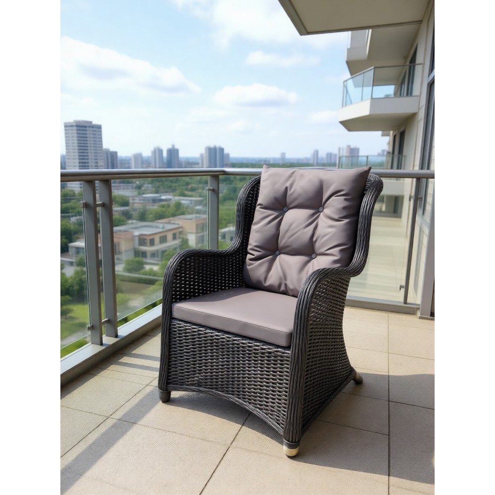 Кресло к комплекту AMARANT в серо-коричневом цвете. Прочный стальной каркас, окрашенный порошковым методом. Нить сфера. Экоротанг высшего качества. Изделие не боится влаги, прямых солнечных лучей, мороза. Температура эксплуатации от -16 до + 50. Легко моется. Не требует особого ухода. Подушки в комплекте. Гарантия 2 года.